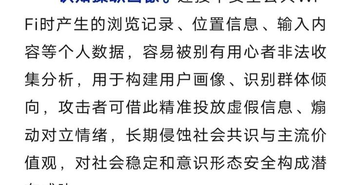 By - admin国安部披露:境外间谍情报机关在政府周边等特定区域设置恶意Wi-Fi,公职人员不慎连接 敏感信息或被全程监控国家安全部提醒公众,公共Wi-Fi虽然便捷,但隐藏数据窃取和网络攻击风险,呼吁用户谨慎使用,避免随意蹭热点。