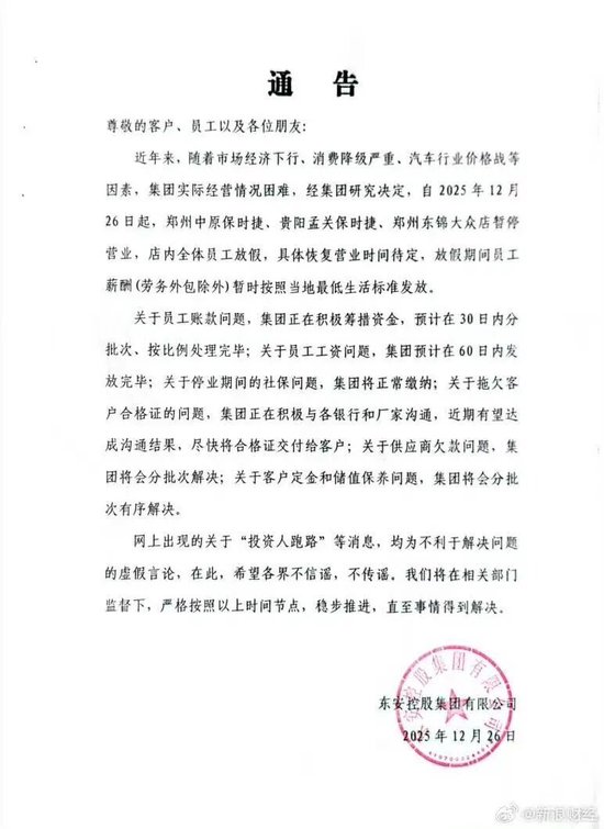 By - admin两家保时捷中心突然闭店,公司回应称不会跑路!有员工担心:工资尚未结算东安控股集团旗下郑州中原保时捷、贵阳孟关保时捷等门店因经营困难已于2025年12月26日起暂停营业,员工放假并按最低生活标准发放薪酬。闭店事件引发消费者定金无法提车、保养权益受损等问题,官方否认“跑路”传言,承诺将负责到底并成立团队处理。集团计划在60日内解决员工欠薪、客户合格证和供应商欠款等问题。东安控股曾为中国汽车经销商百强,涵盖多品牌业务,近期加码新能源转型,体现传统经销商顺应市场变化的趋势。