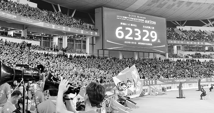 图片说明: 11月1日,“苏超”决赛现场的大屏幕显示共有62329名球迷到场观赛。 (视觉中国) 美联社11月